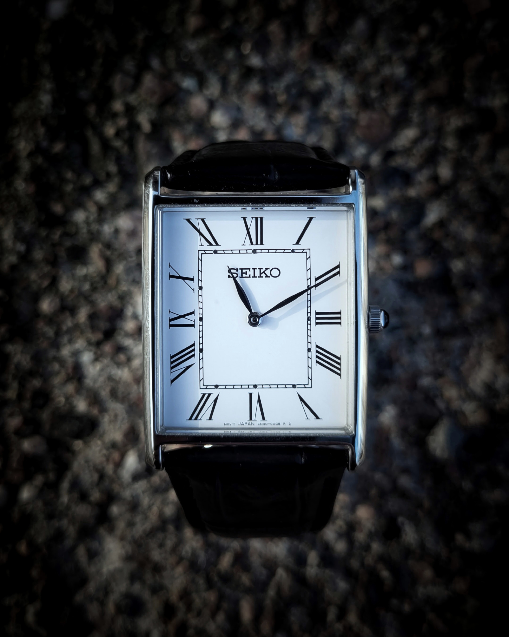 Leman Panama moonsphase watch close-up image against a black leather background featuring a black leather strap