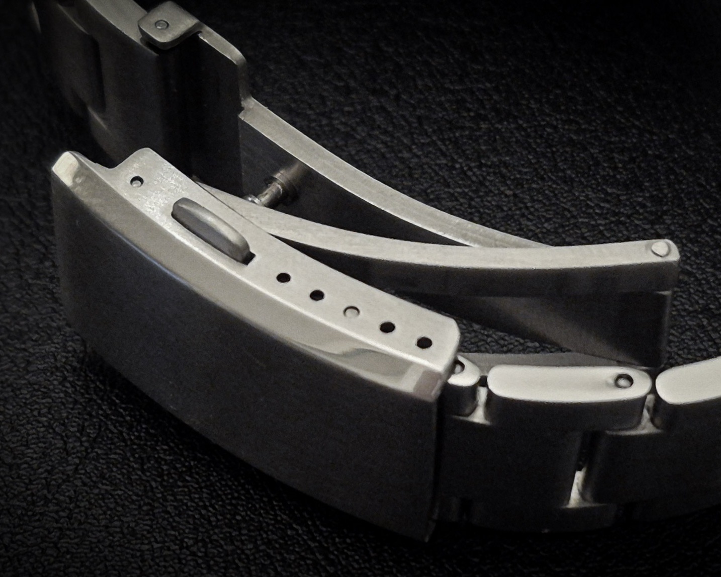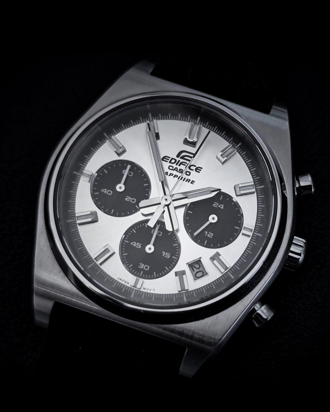 Photo of the Casio Edifice EFB-730D-7AV with a black WIS rubber strap next to the stainless steel bracelet