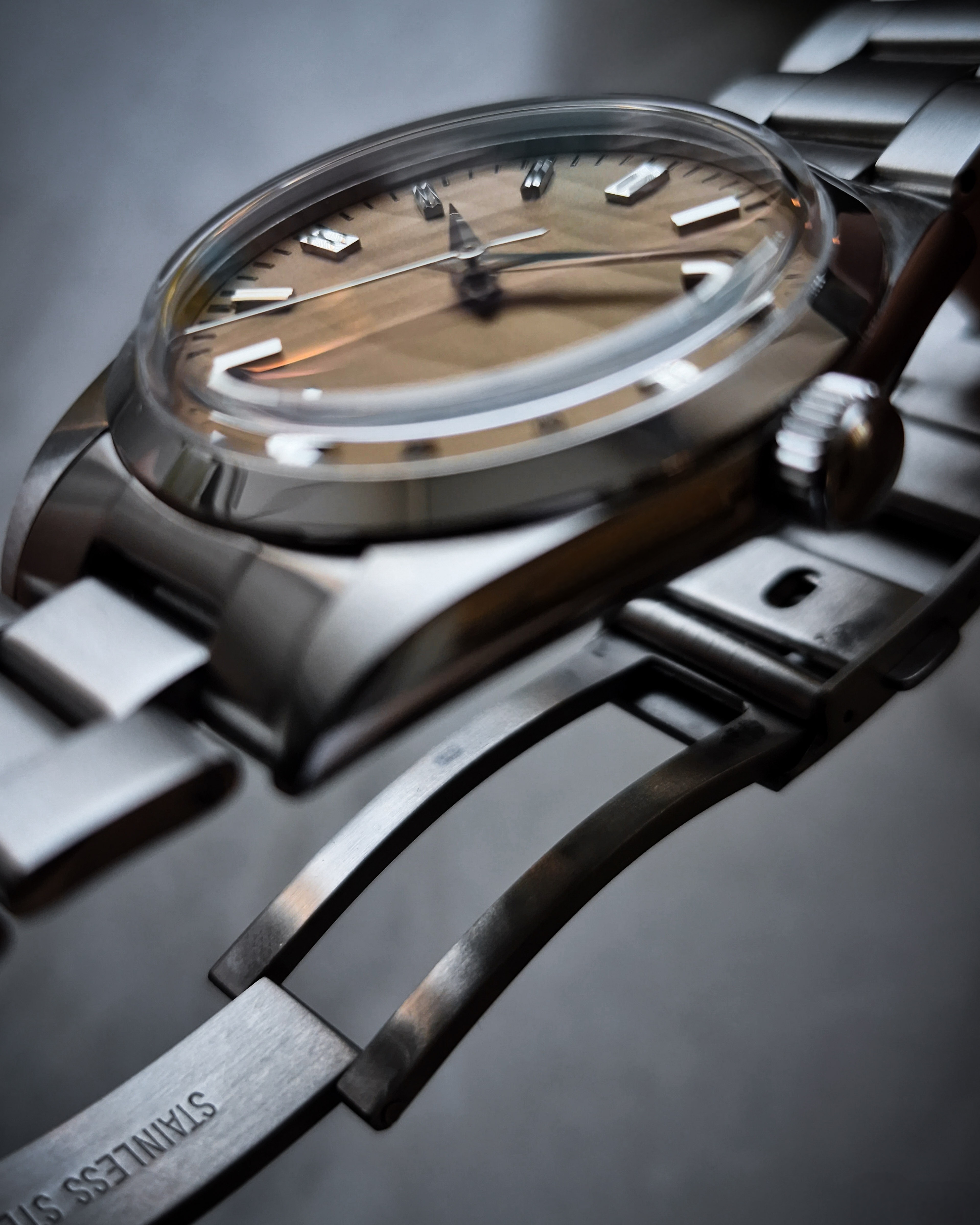 Leman Panama moonsphase watch close-up image against a black leather background featuring a brown leather strap